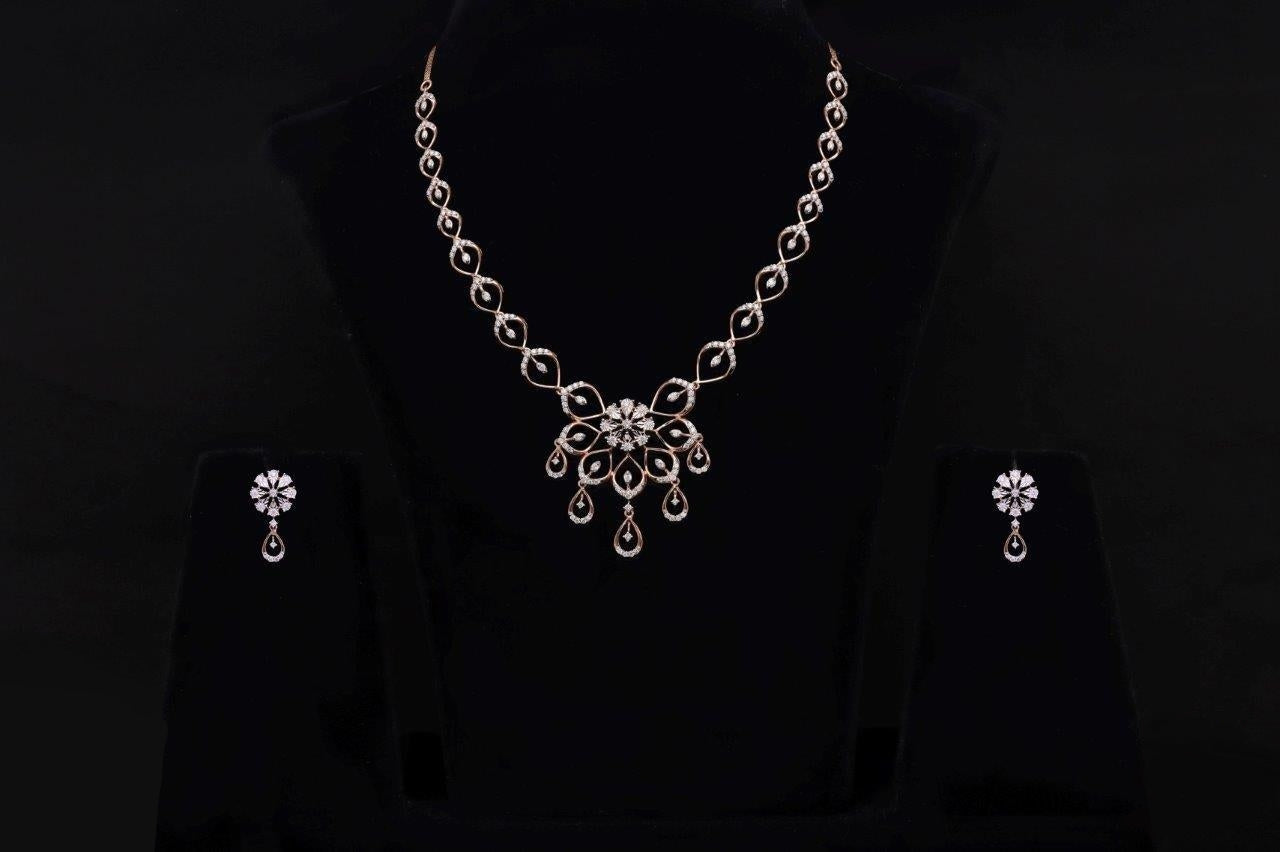 Indulge in the beauty of this luxurious rose gold jewelry set, featuring a statement necklace paired with elegant earrings. Both pieces are adorned with sparkling natural diamonds, offering a perfect blend of sophistication and glamour. Made from 18K rose gold, this set is designed to be cherished for a lifetime, adding a timeless elegance to your jewelry collection.
